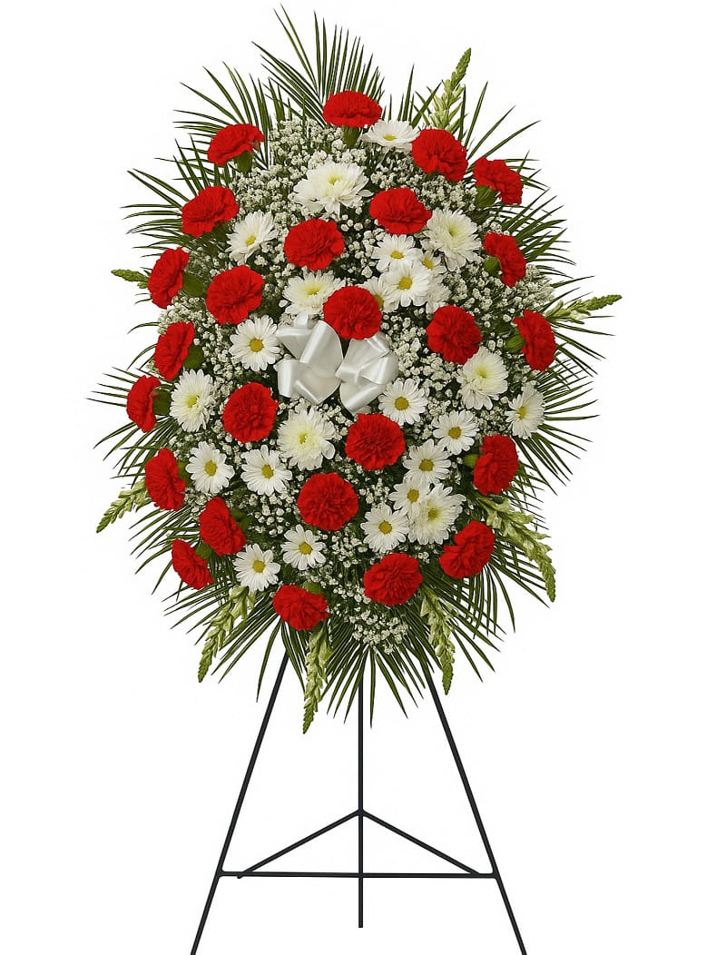 The contrast of red and white expresses both grief and gratitude, offering comfort and strength to those who mourn while celebrating the life and legacy of a loved one. Perfect for funeral services, memorials, or graveside tributes, this standing spray represents honor, compassion, and eternal affection.